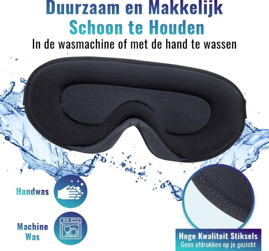 Het 3D-ontwerp zorgt ervoor dat er geen druk op je ogen wordt uitgeoefend. De uitholling bestaat uit één gat voor beide ogen en is 1,2 cm diep. Je wimpers zullen het stof niet raken en je kunt comfortabel je ogen openen als je het masker draagt. Door de verstelbare band met gesp kun je het masker ook zo strak of los maken als je zelf prettig vind.