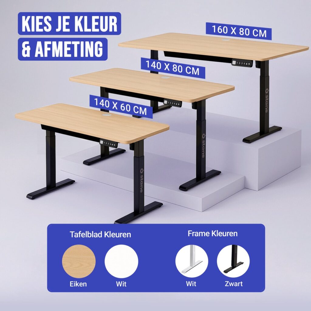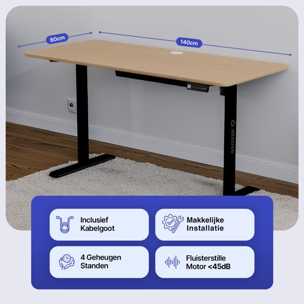 Dit elektrische zit-sta bureau biedt de perfecte combinatie van ergonomie en stijl voor jouw werkplek. Met een stevige constructie en een elegant design is dit bureau ideaal voor zowel thuis- als kantoorwerk. Dankzij de elektrische hoogteverstelling kun je moeiteloos wisselen tussen zitten en staan, waardoor je een gezonde werkhouding behoudt en rugklachten voorkomt. De ruime tafelbladoppervlakte biedt voldoende ruimte voor al je werkbenodigdheden, van een laptop tot meerdere beeldschermen.