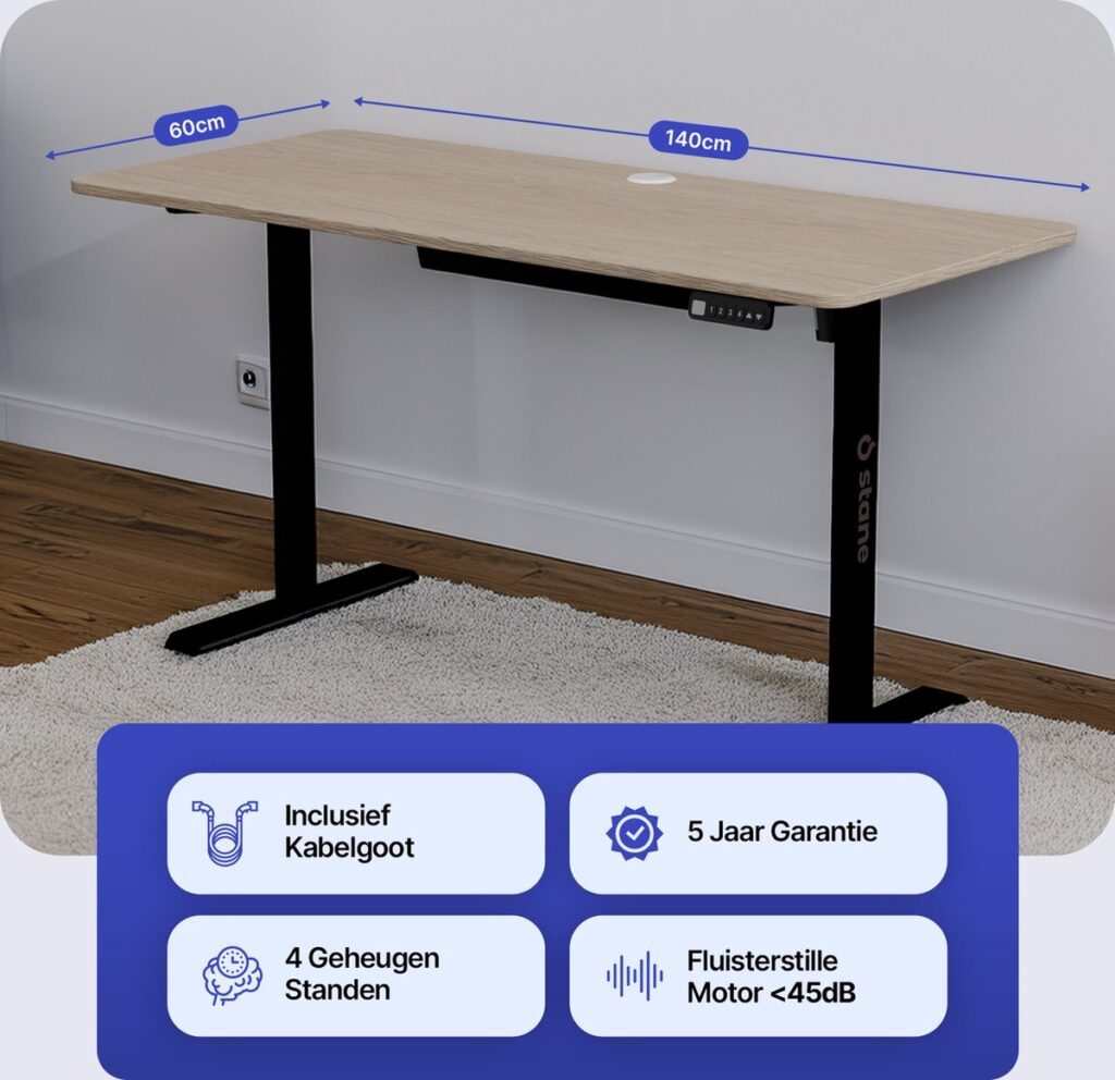 Dit elektrische zit-sta bureau biedt de perfecte combinatie van ergonomie en stijl voor jouw werkplek. Met een stevige constructie en een elegant design is dit bureau ideaal voor zowel thuis- als kantoorwerk. Dankzij de elektrische hoogteverstelling kun je moeiteloos wisselen tussen zitten en staan, waardoor je een gezonde werkhouding behoudt en rugklachten voorkomt. De ruime tafelbladoppervlakte biedt voldoende ruimte voor al je werkbenodigdheden, van een laptop tot meerdere beeldschermen.