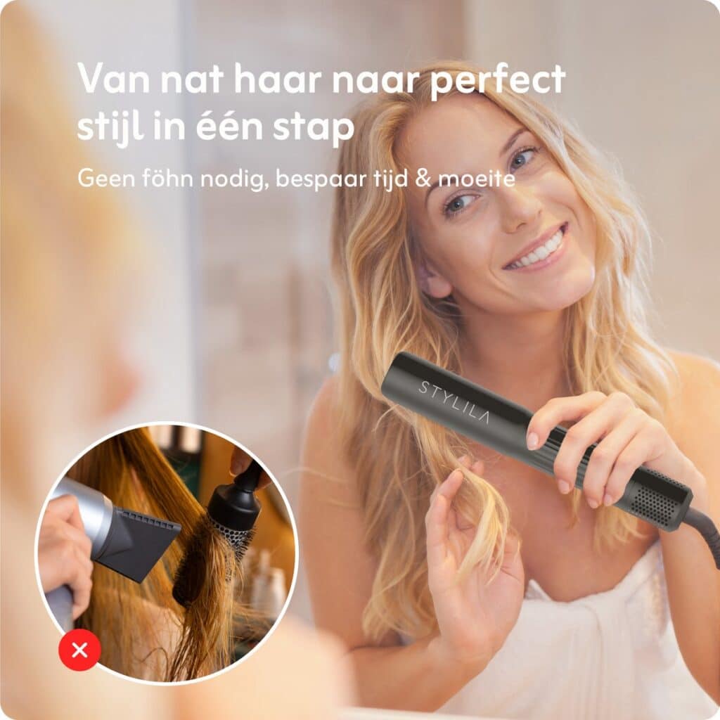 Zeg vaarwel tegen beschadigd haar en eindeloos stylen. Ontdek de Stylila® AirStraight – de nieuwe standaard in gezond haar stylen. Ben je het zat om je haar te beschadigen met hete platen en te worstelen met föhn én stijltang? Kies voor de lucht stijltang van Stylila, de 2-in-1 oplossing die je haar beschermt en tijd bespaart. Dankzij de innovatieve luchtstroomtechnologie en geïntegreerde ionentechnologie droog en stijl je je haar in één stap — zonder het uit te drogen of te verzwakken. Sterk, glanzend en pluisvrij haar, elke dag weer.