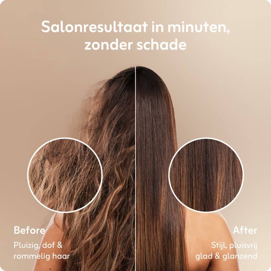 De ingebouwde ionentechnologie neutraliseert statische elektriciteit en sluit de haarschubben, wat resulteert in zijdezacht, glad en pluisvrij haar met een natuurlijke glans. Je haar voelt niet alleen gezonder aan, het ziet er ook zichtbaar stralender uit – alsof je net van de salon komt!