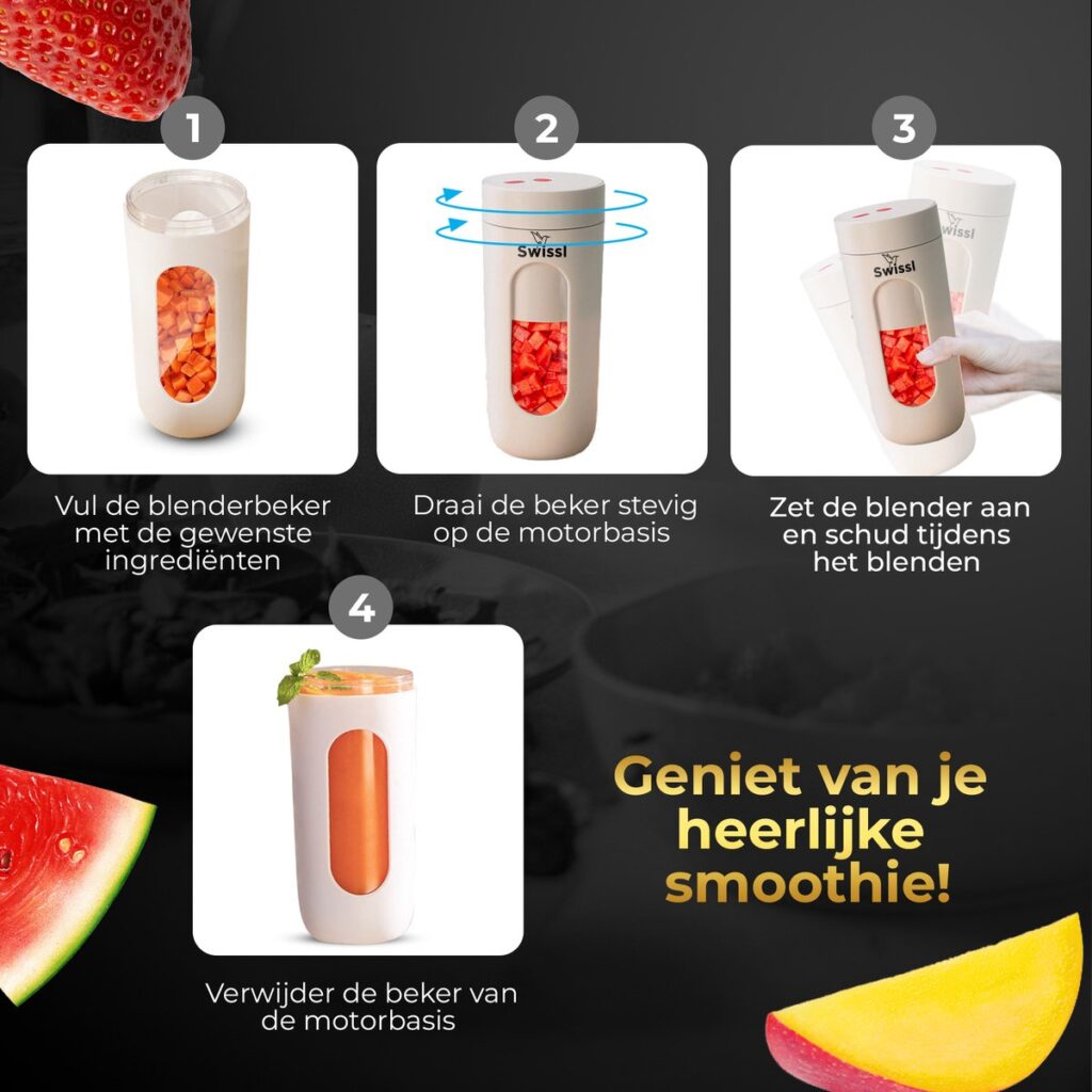 Maak gezonde sappen, shakes en smoothies waar je ook bent met de Swissl Blender To Go! Deze handige blender, speciaal ontworpen voor zacht groenten en fruit, maakt het bereiden van verfrissende drankjes een fluitje van een cent. Met zijn oplaadbare ontwerp en compacte formaat neem je deze blender gemakkelijk overal mee naartoe, zodat je altijd kunt genieten van verse en voedzame traktaties.