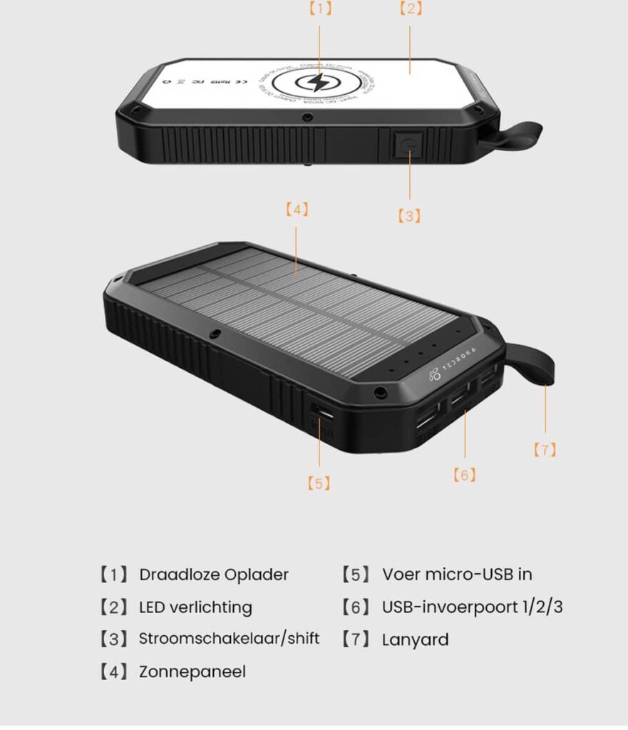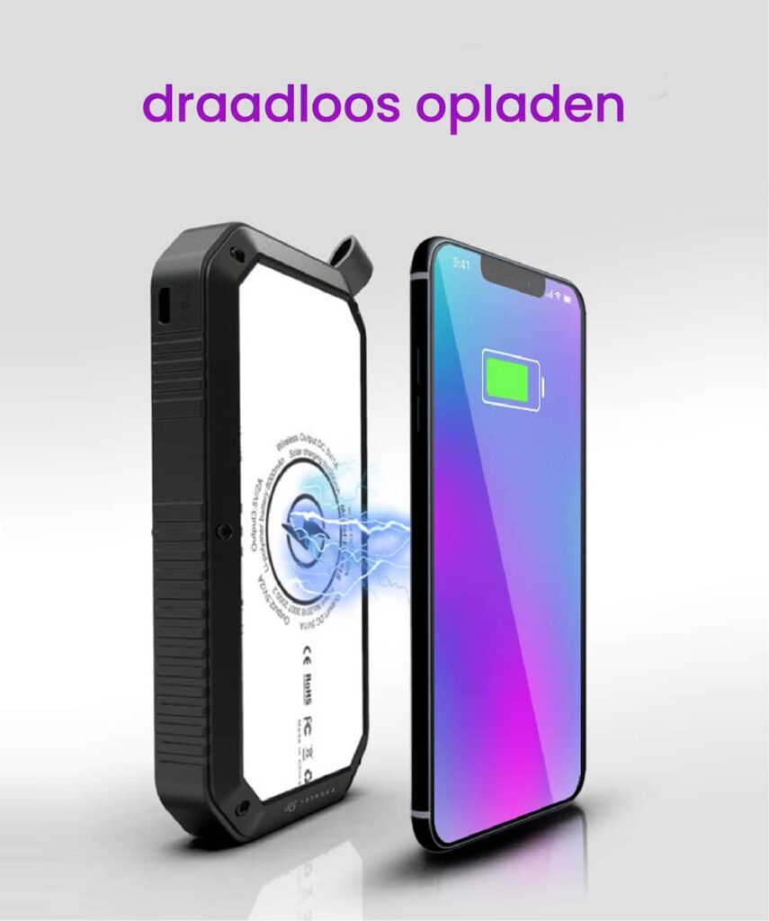 Maak kennis met de geavanceerde 10.000mAh draadloze powerbank met zonne-oplaadmogelijkheid! Dit multifunctionele apparaat dient niet alleen als draadloze powerbank, maar functioneert ook als draadloze oplader die compatibel is met een breed scala aan populaire apparaten, waaronder iPhone XR/XS/XS Max/X/8/8plus en Samsung Galaxy S9/S9plus S8/S8plus, evenals alle andere qi-compatibele mobiele apparaten. Of u nu op een kampeertrip bent of gewoon onderweg, deze draagbare draadloze oplader met zonne-oplaadmogelijkheid is de ultieme keuze voor uw energiebehoeften.