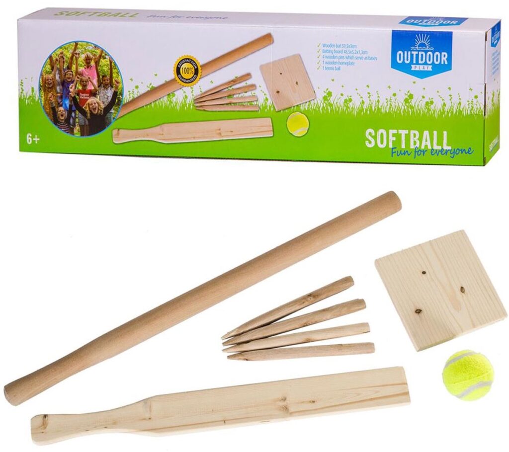 Outdoor Play slagbal set Organiseer een potje slagbal met jouw vrienden! Je kunt het spel op twee moeilijkheidsgraden spelen: beginners gebruiken het plankje om te slaan en gevorderde spelers kunnen de knuppel gebruiken. Deze set bestaat uit een: houten knuppel (59,5 x 3 cm), houten slagbal plankje (48,5 x 5,2 x 1,3 cm), 4 houten pennen die als honken dienen, 1 houten thuisplaat 1 tennisbal. Wordt geleverd in full-colour doos met uitgebreide handleiding. Geschikt voor kinderen vanaf 6 jaar.