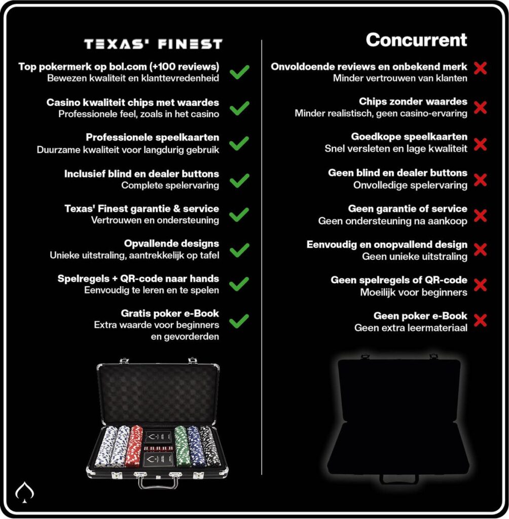 Kortom: Maak indruk bij je volgende pokeravond en kies vandaag nog voor de de Texas’ Finest pokerset die ideaal is voor een gezellig avondje pokeren met je vrienden!