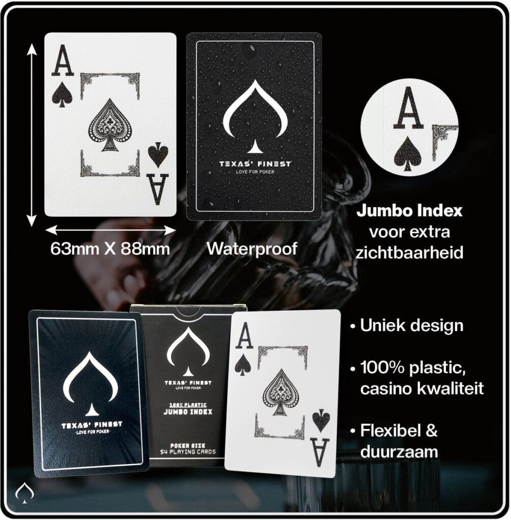 Onze speelkaarten zijn van plastic, bevatten de Jumbo Index en hebben de poker grootte (63 mm x 88 mm). Plastic speelkaarten zorgen voor flexibiliteit en resistentie tegen slijtage en vocht. Hierdoor gaan de kaarten extra lang mee en ga je voor een duurzame keuze. Dit zijn eigenschappen die niet terugkomen bij de meer gebruikte papieren speelkaarten. Daarnaast maken de kaarten gebruik van de Jumbo Index hierdoor kun je de kaarten makkelijk lezen. Daardoor verloopt je spel soepeler en zie je geen enkel detail over het hoofd. Door de poker groote van de kaarten liggen ze lekker in de hand en is delen makkelijk.