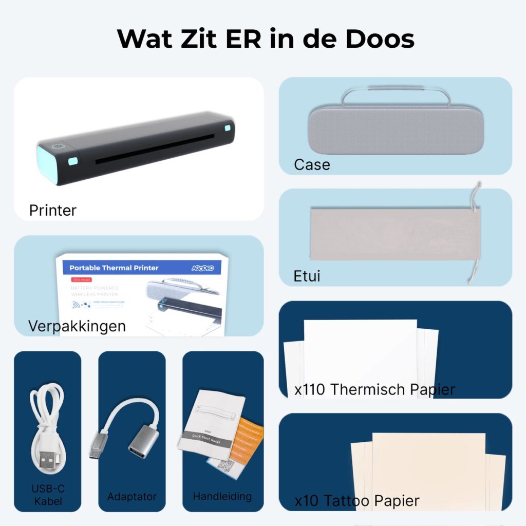 Waar andere printers je alleen het apparaat leveren, krijg je bij AgoDeo direct een compleet startpakket: 110 vellen thermisch papier, 10 tattoo transferpapieren, een handige USB-C adapter én een luxe draagtasje. Zo kun je meteen beginnen zonder extra kosten.