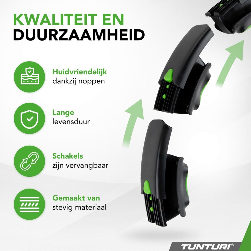 Bij het ontwerp van de Tunturi Hoelahoep is aan alles gedacht: van de hoogwaardige, duurzame materialen tot aan de comfortabele binnenkant. Dit betekent dat je geniet van een zachte, aangename aanraking op je huid, terwijl je weet dat je hoelahoep gebouwd is om de test der tijd te doorstaan. Zo kun je met een gerust hart swingen naar een fitter lijf.