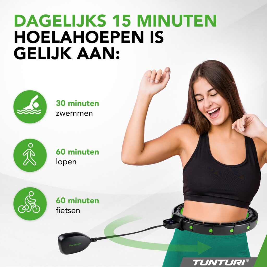 Wist je dat dagelijks 15 minuten hoelahoepen gelijkstaat aan 30 minuten zwemmen, 60 minuten lopen of fietsen? Deze Tunturi hoelahoep met gewicht maakt je training dus niet alleen leuker, maar ook veel efficiënter. De toevoeging van gewicht intensifieert je oefeningen, waardoor je meer calorieën verbrandt en je fitnessdoelen sneller bereikt. Zo combineert de Tunturi Verstelbare Smart Hoelahoep plezier met functionaliteit en efficiëntie, waardoor het een ideale keuze is voor een drukke levensstijl.