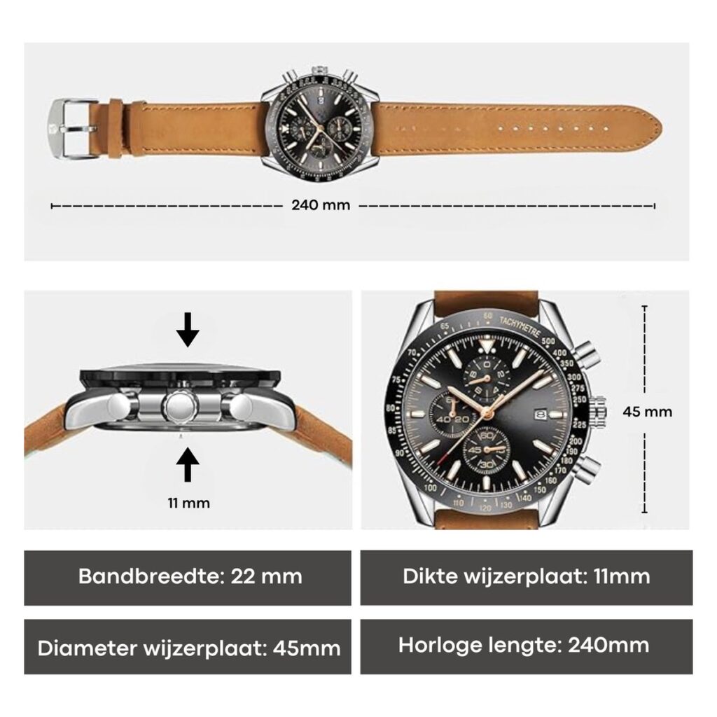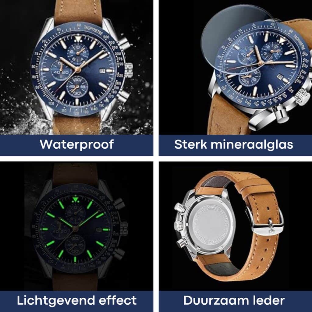 Met waterbestendigheid tot 30 meter, lichtgevende wijzers en een nauwkeurige chronograaf biedt dit horloge alles wat je nodig hebt voor een actieve, stijlvolle levensstijl.