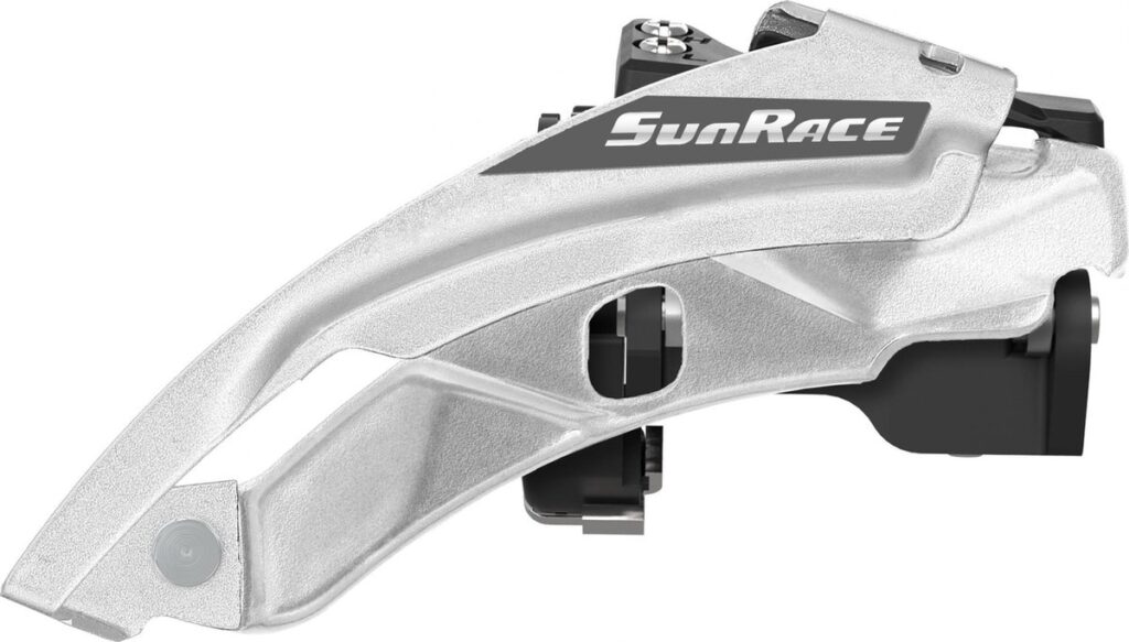 Sunrace voorderailleur FDM500 Specificaties: Kleur: zilver Materiaal: aluminium Type: triple Type fiets: MTB Aantal versnellingen: 7/8 speed Diameter: 34,9 / 31,8 / 28,6 mm Maximale kettingbladgrootte: 42-34-24T Gewicht: 146 gram Kabelroute: dual pull