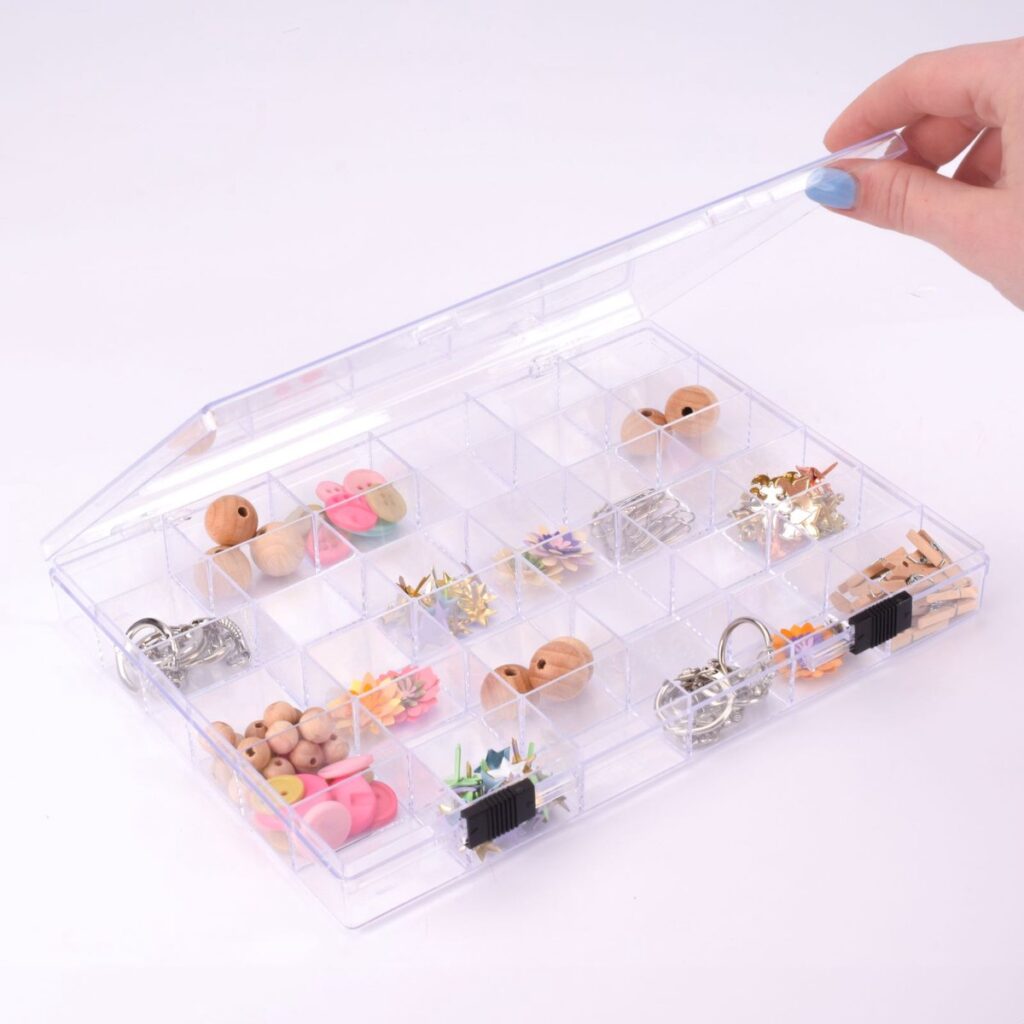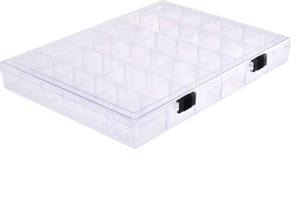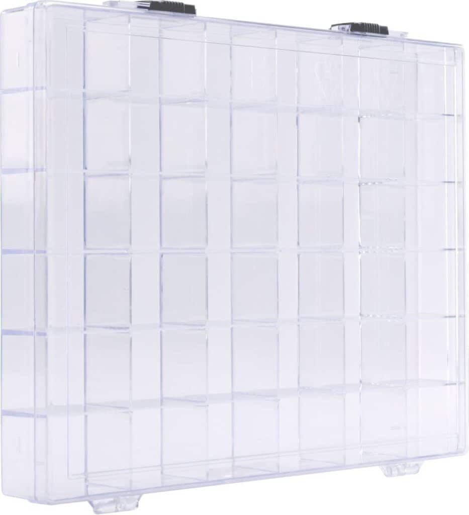 Deze opbergbox van Vaessen Creative is een perfect opbergsysteem om kleine knutselspullen te sorteren. De box is gemaakt van doorzichtig plastic en is 24,7 x 19,2 x 2,9 cm groot. De box is verdeeld in 36 vakken van 4 x 2,9 x 2,8 cm, ideaal om kralen, glitters, knopen, pailletten, steentjes of andere kleine versieringen in te bewaren. De box heeft twee kliksluitingen aan de bovenkant en is makkelijk mee te nemen. Een handig opbergsysteem voor diamond painting, kaarten maken, borduren, sieraden maken, scrapbooken of andere mixed media hobbies.