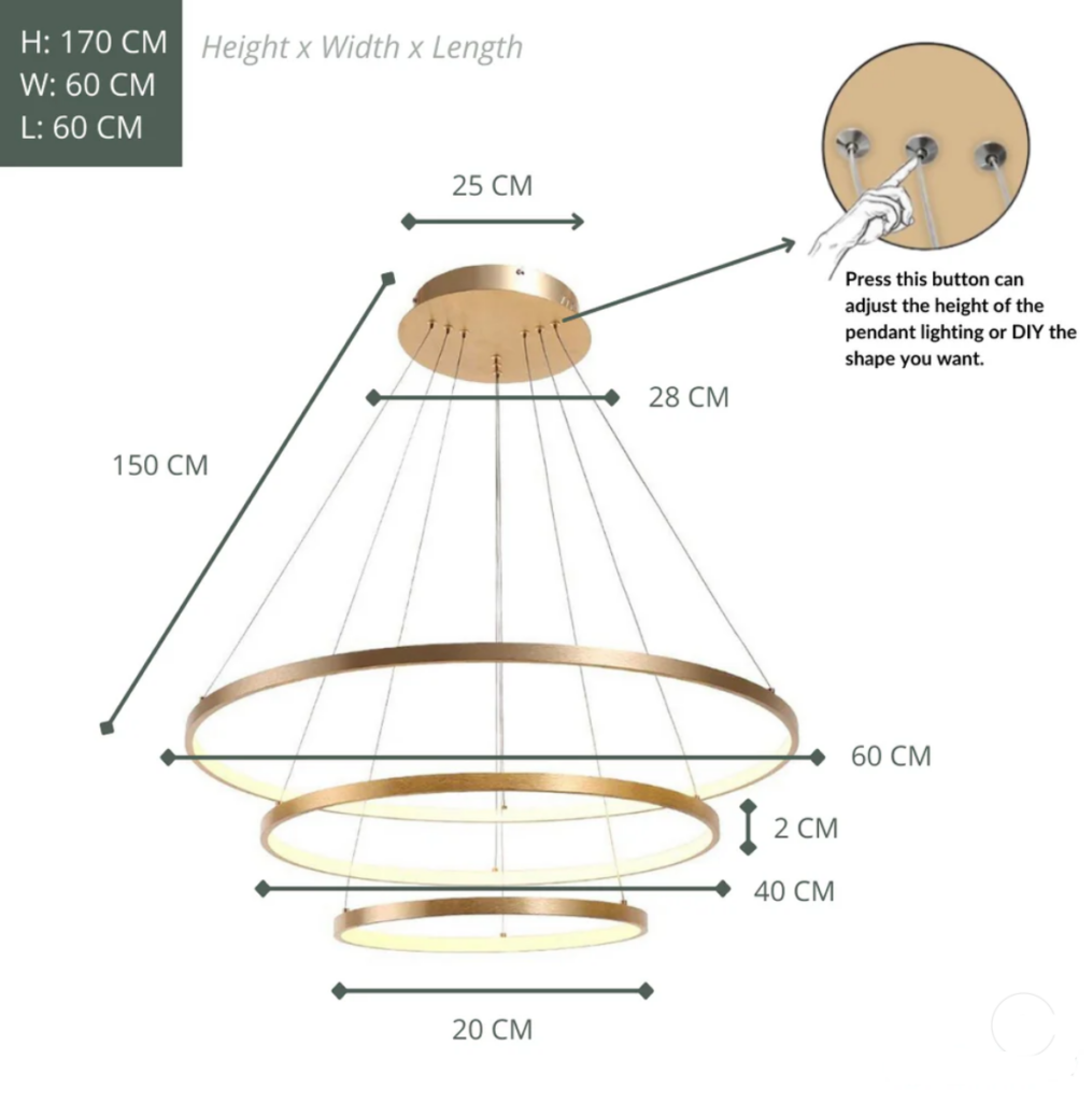 Deze prachtige hanglamp bestaat uit drie cirkelvormige ringen in verschillende diameters (20-40-60 CM / 40-60-80 CM) die samen een harmonieus geheel vormen.
