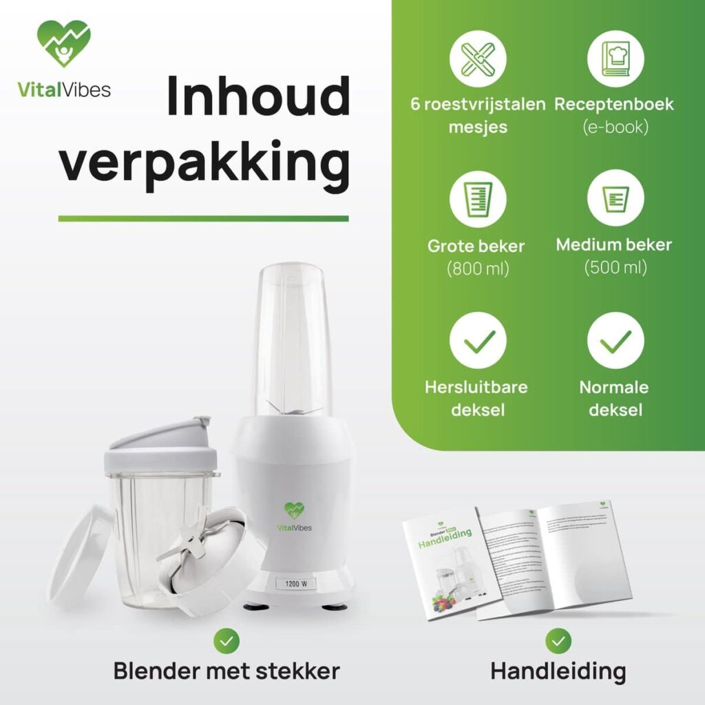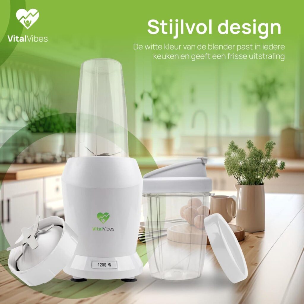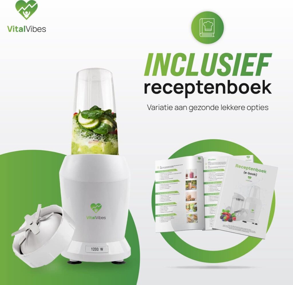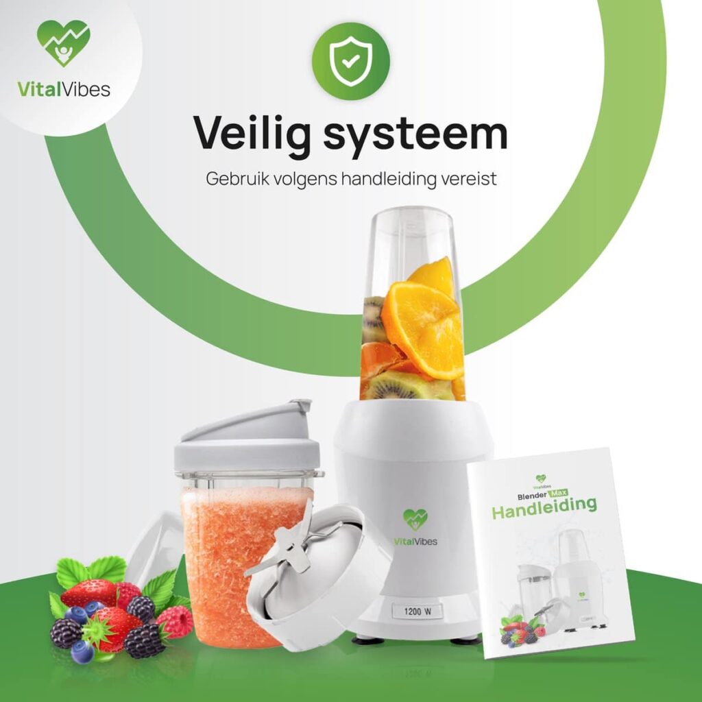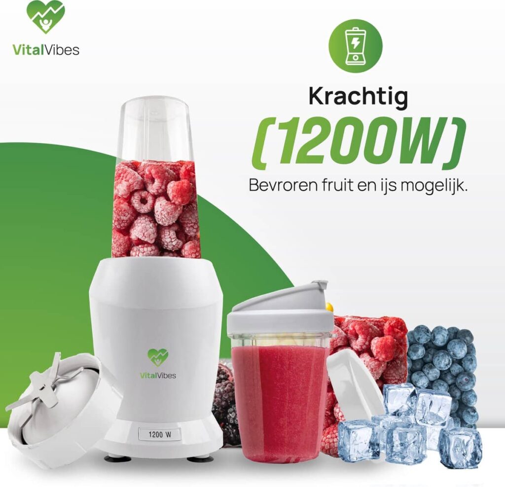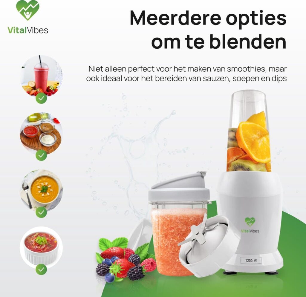 Op zoek naar een blender die past bij jouw gezonde levensstijl? Maak kennis met de Blender Max van VitalVibes! Door een vermogen van 1200W is deze smoothie maker dé perfecte keuze voor jouw portie vitamines. Met de to go bekers (800 ml en 500 ml) kun je jouw favoriete smoothie altijd en overal meenemen. Gebruik ook ons receptenboek voor inspiratie. Gezond genieten was nog nooit zo makkelijk!