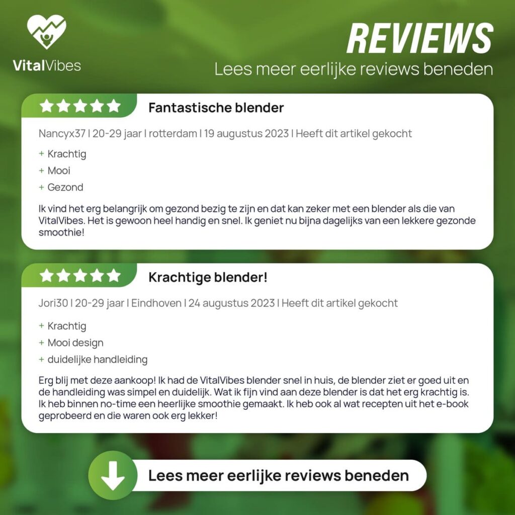 VitalVibes is gespecialiseerd in blenders. Met onze kennis en ervaring kunnen wij je zo goed mogelijk helpen. Wij hebben al vele mensen blij kunnen maken, ben jij de volgende?