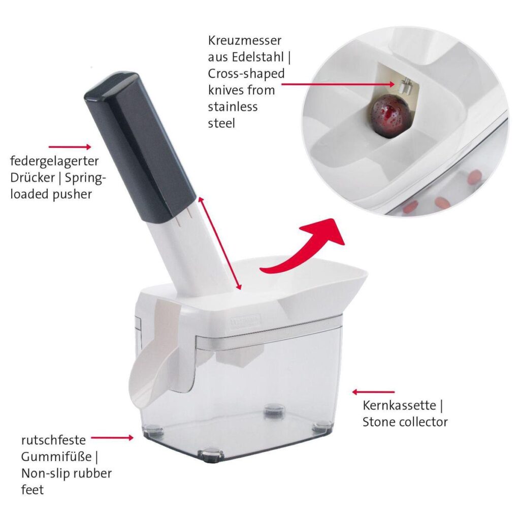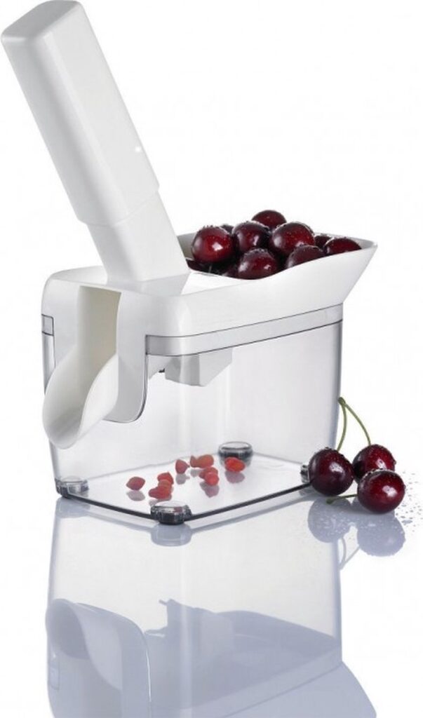De Kernfix kersenontpitter van Westmark is dé tool als er in een korte tijd een grote hoeveelheid kersen moeten worden ontpit, maar liefst gemiddeld 12 kg per uur. Ook voor het ontpitten van diepgevroren en geconserveerde kersen is deze kersenontpitter perfect. Het naar beneden gerichte vulplateau zorgt voor een optimaal snelle doorvoer van de kersen. Vervolgens druk je het handvat naar beneden en de pit en steel zullen snel en hygiënisch uit de kers worden verwijderd. De ontpitter is gemaakt van kunststof en heeft een RVS mesje. Na gebruik kan deze ontpitter gereinigd worden in de vaatwasmachine. De afmeting van deze kersenontpitter is 20,5 x 11,8 x 30 cm.