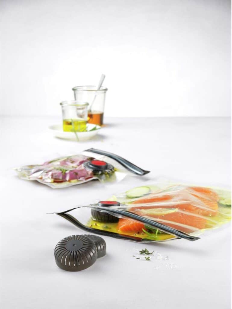 Transformeer uw diepvries in een versmarkt bij u thuis en vries seizoensgroenten, brood, gevogelte en vlees gewoon in. De vacuümzak gebruiken is kinderspel: open de zak, vul hem met het voedsel dat u wilt invriezen, sluit hem en zet de handige draadloze vacuümpomp op het ventiel. Met één druk op de knop zuigt de pomp de lucht in slechts enkele seconden uit de zak. Het enige wat u nog hoeft te doen, is de drukknop in het midden van het rode siliconenventiel indrukken om de zak goed af te sluiten. Op deze manier worden de aroma’s en vitamines optimaal vastgehouden en blijft het voedsel tot vijf keer langer vers! Van vriesbrand is geen sprake meer!